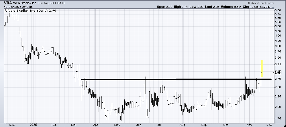 Vera Bradley (VRA) still has a nice base. I fear the volume (not shown) these last few days means it is a meme stock, though. If it falls back under $2.75, I’d run for the hills.
