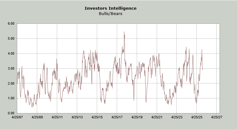 I want to note a change in sentiment. Yes, there are statistics, but also – well, pre the NVDA earnings — I detected a change in tone from the talking heads. Three weeks ago, it was all sunshine. Recall the Investors’ Intelligence bull/bear ratio was 4.25, which told us things had gotten giddy.