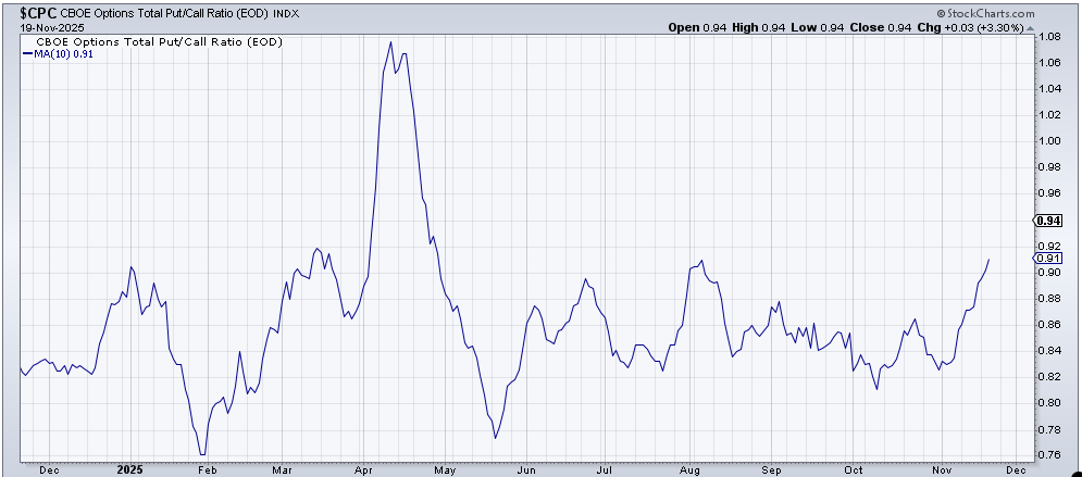 And then there is the ten-day moving average of the put/call ratio. In early October, it was .81. Now it is .91, and since the calendar turned to November, it has literally been a nonstop rise.