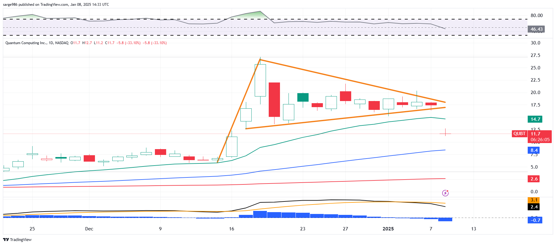Funny enough, QUBT told us that something explosive was about to happen. That pennant in place since the mid-December spike was a non-directional warning. Now, we know the direction. I missed it. That's why I didn't warn you. I would not at all be surprised to see the shares trade as low as the 50-day simple moving average. I will be a buyer between the $12.25 paid overnight in that private placement and the stock's 50-day SMA, which is currently $8.40.