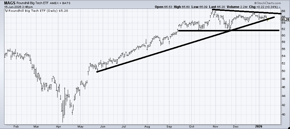 The chart of Roundhill Magnificent Seven ETF (MAGS) , an ETF to be long Big Cap Tech looks pretty similar to the QQQs. There is some support here, but a break here and I think that lower line ($62-ish) comes into play.