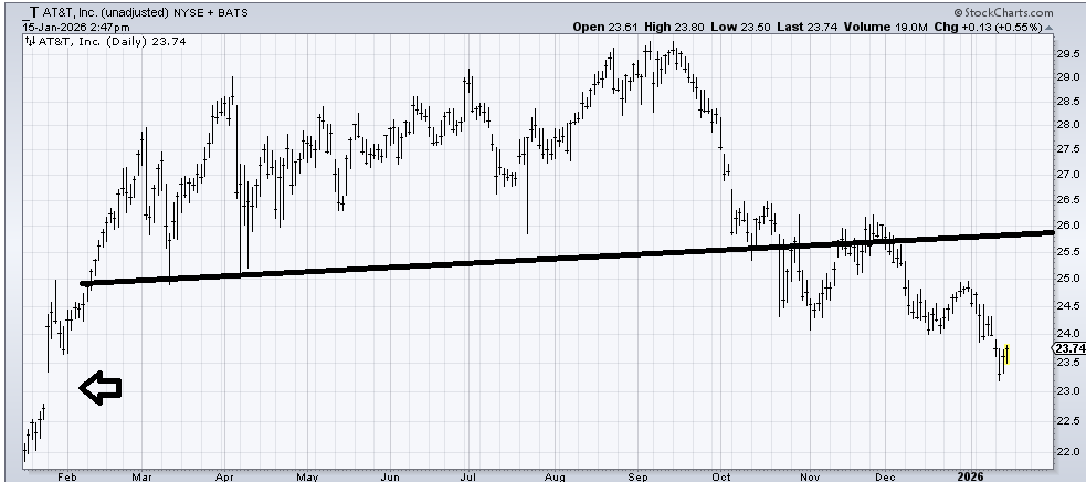When AT&T (T) started breaking down I decided I wanted it to fill that gap from February last year. It would complete a measured target as well. If it can drop down there I would look to buy. Alternatively, if it can recapture $24 like it means it then I’d take another look at the stock.