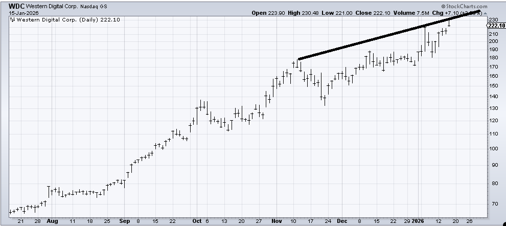 The first is Western Digital (WDC) . It’s been a super-hot stock and Thursday was no different as it gapped up. Only Thursday it closed at the low of the day. If there is follow through on the downside it would signal that this hot stock will also be part of the overbought pullback. If WDC gaps down and leaves Thursday as an island, that would be bearish.