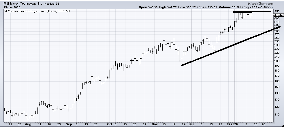 The other stock is Micron Technology (MU) . We looked at it last week and I leaned toward being a profit taker. But we want to watch it because despite the SOX making a higher high Thursday, this stock hasn’t made a higher high in almost two weeks. And it closed at the low Thursday. I think MU is due a correction. If it breaks under $320 then there is a chance it comes down to tag that uptrend line.