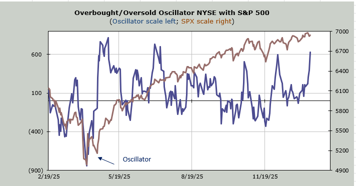 Now back to the overbought condition. As I noted Wednesday night I think the overbought condition is in the 493, which would seem normal since that’s where the action has been. You can see my Overbought/Oversold Oscillator, which is based on breadth not price, is clearly overbought.