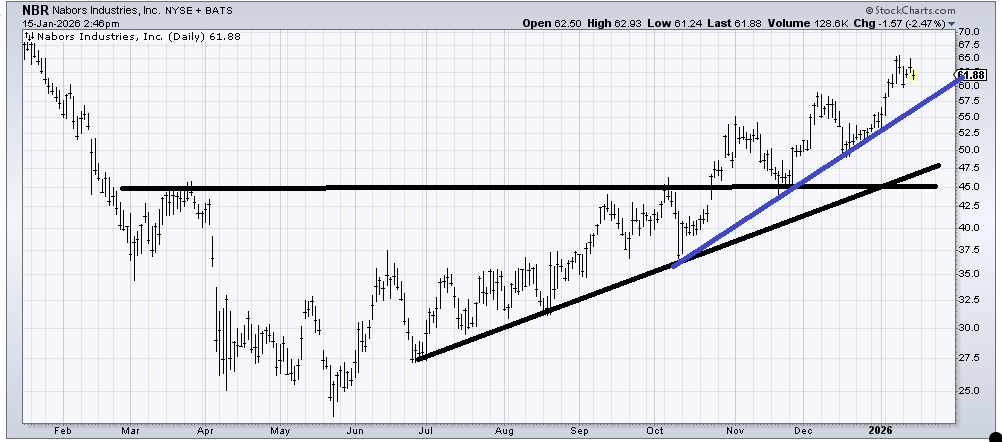 Nabors Industries (NBR) has met its upside target of $65 so a correction is not out of the question. I would love to see if it can get to the blue line ($57-ish) and hold on. My guess is a bounce from there.