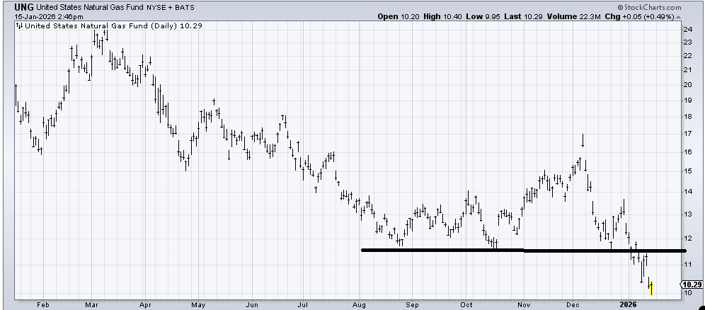I often refer to United States Natural Gas Fund (UNG) , an ETF to be long natural gas, as a widow maker and I hope you can see why. It is getting oversold down here. The DSI was 28 Wednesday night, which is not that low. For now I’d say a rally to $11.50 would be a good place to sell it.