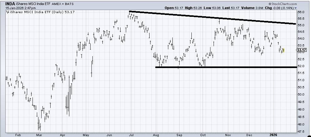 I still think iShares MSCI India ETF (INDA) , an ETF to be long India, is trying to bottom but boy has it been frustrating. As long as it stays over $52-ish that’s my plan: that this is a bottoming process.