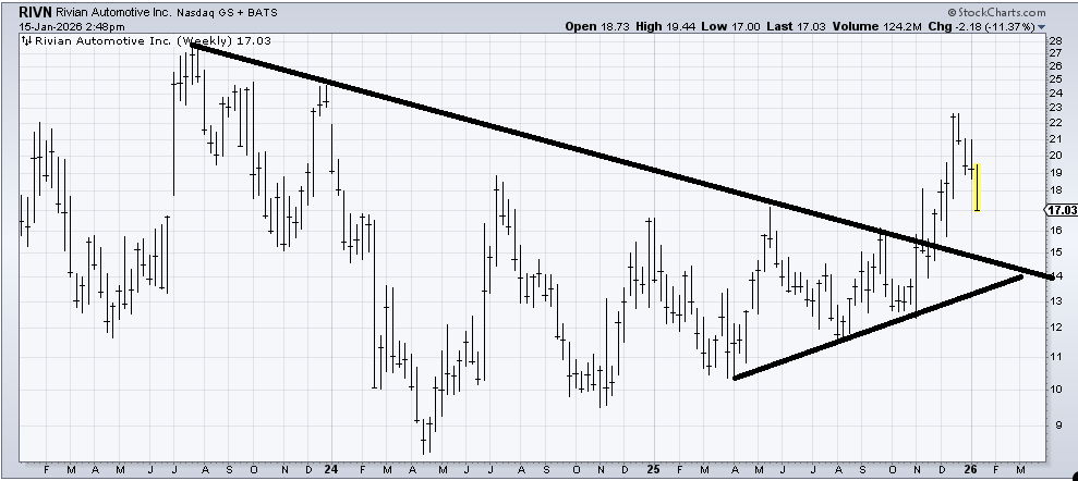 Rivian (RIVN) continues to look like a base on a weekly chart. A pullback into that $15-ish area is probably where it gets interesting again.
