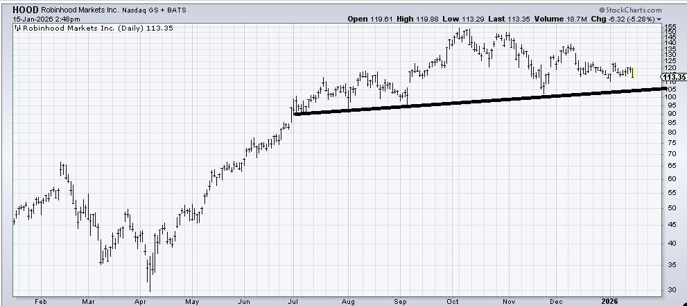 Robinhood (HOOD) still looks to me as if it is coming down to that lower line. If that lower line does not hold and instead breaks, that would complete a top. If it holds this is just a giant consolidation.