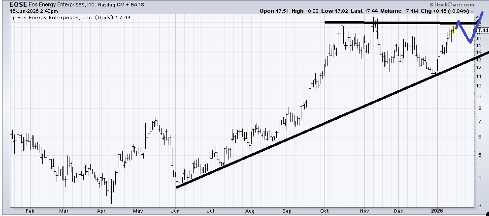 I don’t know if Eos Energy Enterprises (EOSE) can map out as I have drawn in blue, but if it can then the chart would look good to me. Let’s see if that pattern can play out.