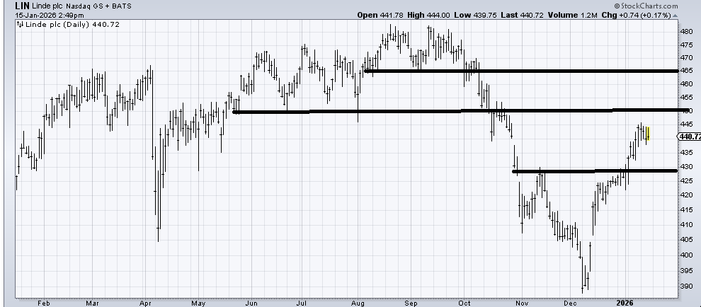 Linde plc (LIN) is trapped between support and resistance so I’d like to see a pullback to the $430 area to be a buyer.