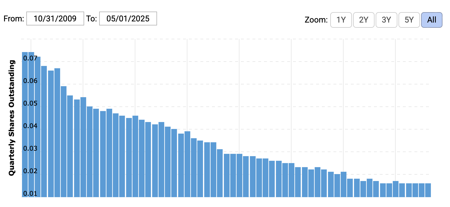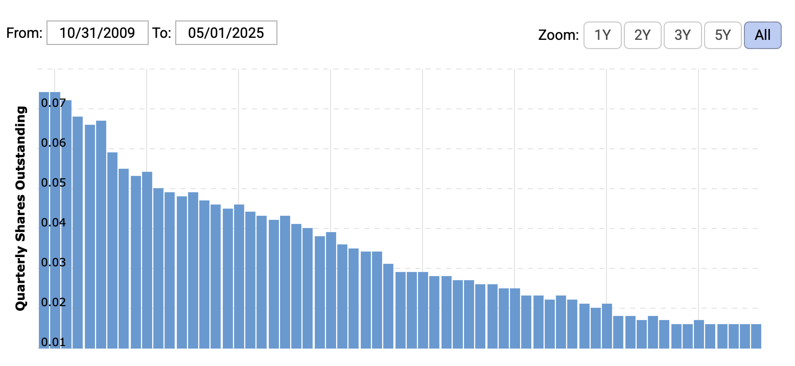 Over the years, Dillard’s has aggressively bought back its own shares. Here’s a look at the decline in Dillard’s shares outstanding over the past 15 years: