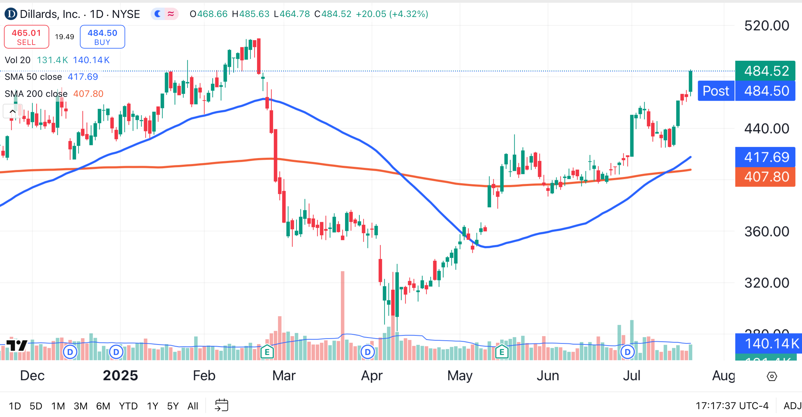 Dillard’s shares returned 288% in 2021, 31.9% in 2022, 24.8% in 2023, and 6.9% in 2024. Shares of the retailer have gained 7.5% year to date. Dillard's is scheduled to report earnings on August 7.