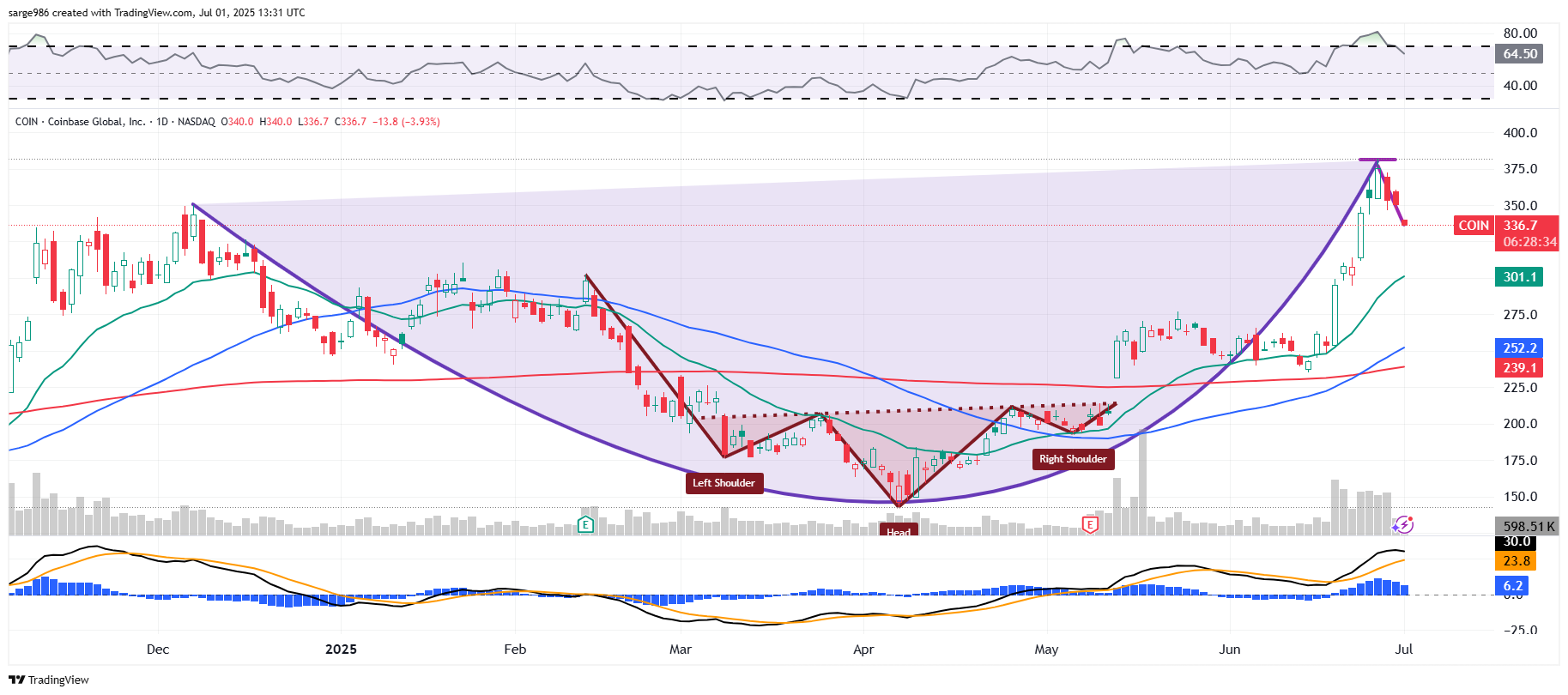 I would like to take my first nibble close to the stock's 21-day exponential moving average, which stands at $297.0, but is rising rapidly. That first nibble will be careful as there is a chance that if the stock goes that far, it could test its 50-day SMA as well. A trader willing to take on some risk and looking to get paid to wait could sell (write) $300 COIN puts expiring on Aug. 8 for a rough $10, depending on the market at the time. That might be worth it.
