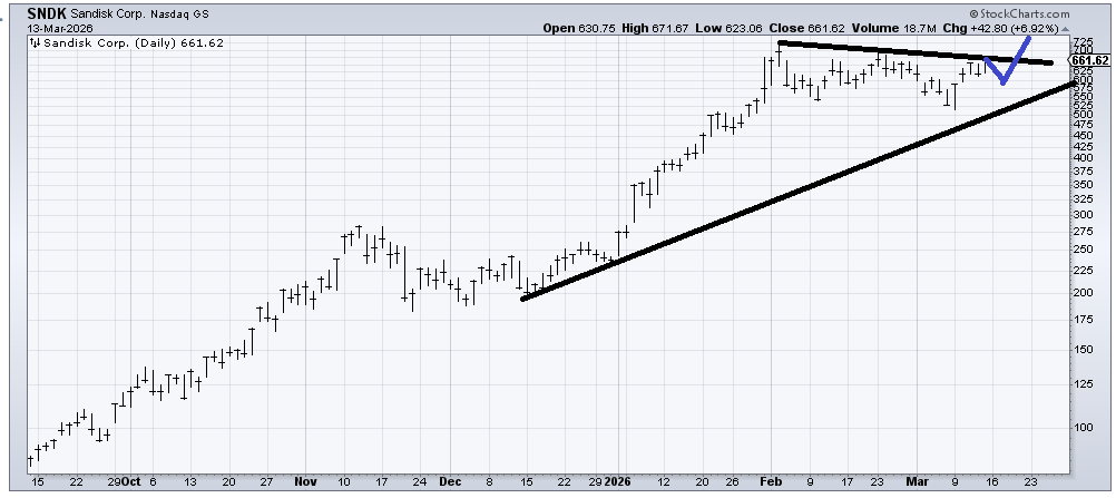 Sandisk (SNDK) has clearly corrected over the last six weeks. So now if it can break out over that line, it would be a positive. Because I love symmetry (it’s a flaw I have!) I would love to see the pattern shape up something akin to what I drew in blue.