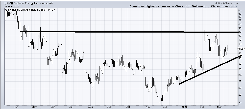 There are so many gaps—up and down—on the chart of Enphase Energy (ENPH) that it is hard to determine which way the next gap will go! Mostly, I see a chart trying to base. Another trip down to that 38-40 area that holds would make this more interesting. I do not want to see a break under 38, though.