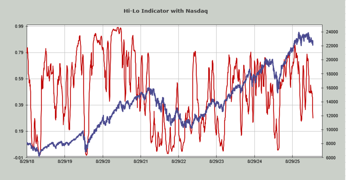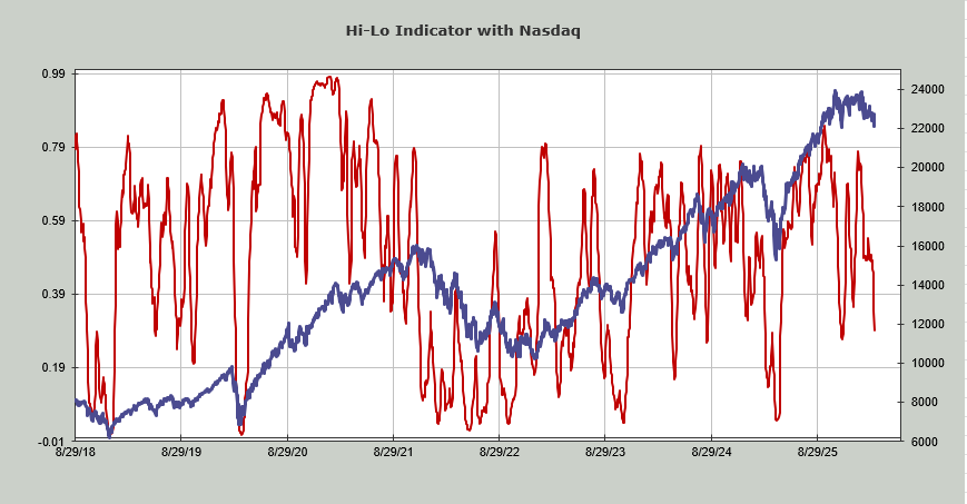 The NYSE Hi-Lo Indicator is currently at .50 which is not oversold either (under .20 gets us there). The Nasdaq Hi-Lo Indicator is much closer to an oversold condition at .29 (under .15 gets us there). The chart is shown below.