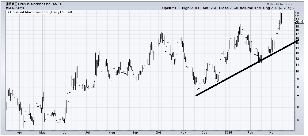 Unusual Machines (UMAC) has a tendency to make a higher high and then go into a multi-week correction (see July, October, and January). If that pattern persists, then I would expect it to tag that uptrend line a few weeks out in time and start to hold for a decent entry with a decent risk/reward.