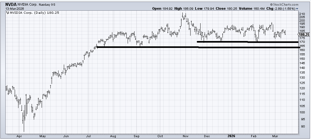 For months, I have been advocating that as long as NVIDIA (NVDA) stays over 170, it is okay. I want to revise that today. I am going to widen the range to 165. I now wonder if breaking 170 would cause some panic, but the support would then be 165.
