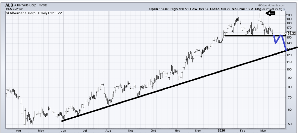 Albermarle (ALB) seems to have generated an island top (arrow) in late February, and if it breaks that 152 area would then measure toward that uptrend line. Due to the market’s short-term oversoldness, I would say if it breaks, it would likely map out as I have drawn in blue.