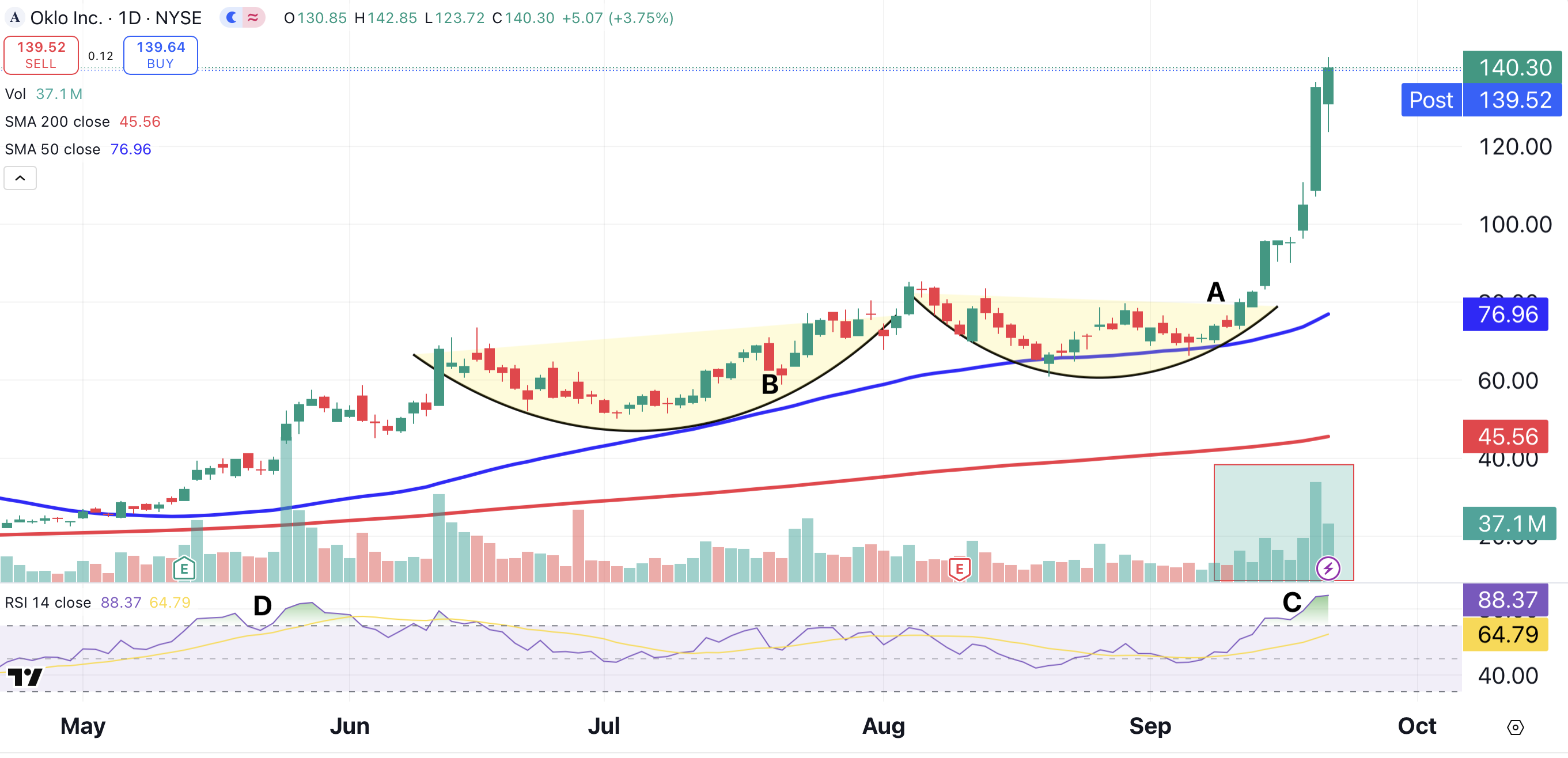 While an overbought reading may sound concerning, note that this stock’s RSI was also overbought in May, when that reading peaked just below 84 (point D). Oklo shares have nearly tripled since then.