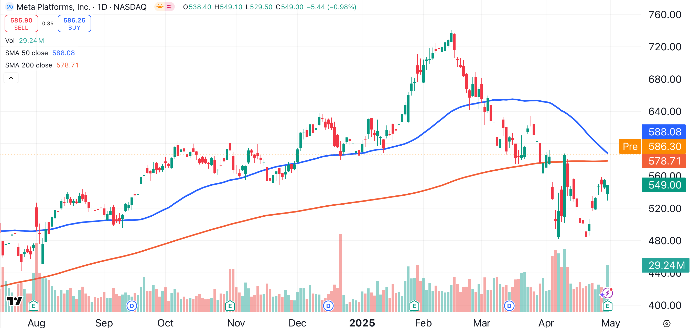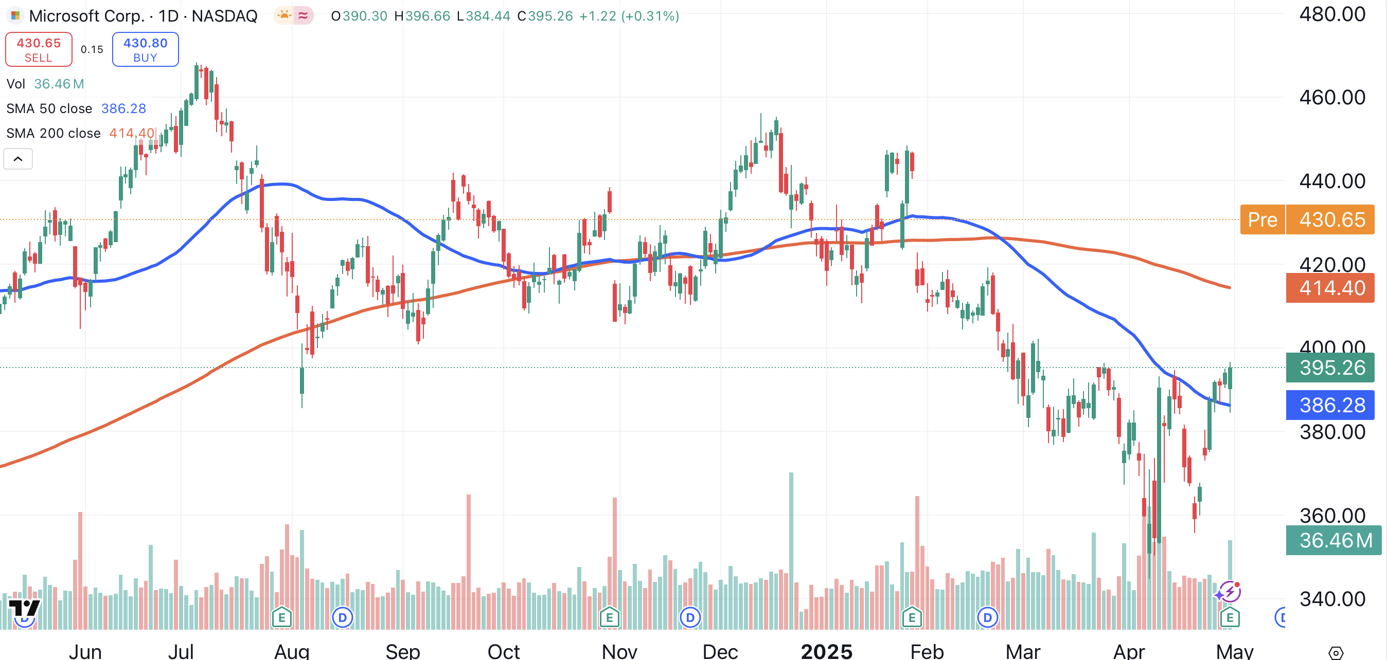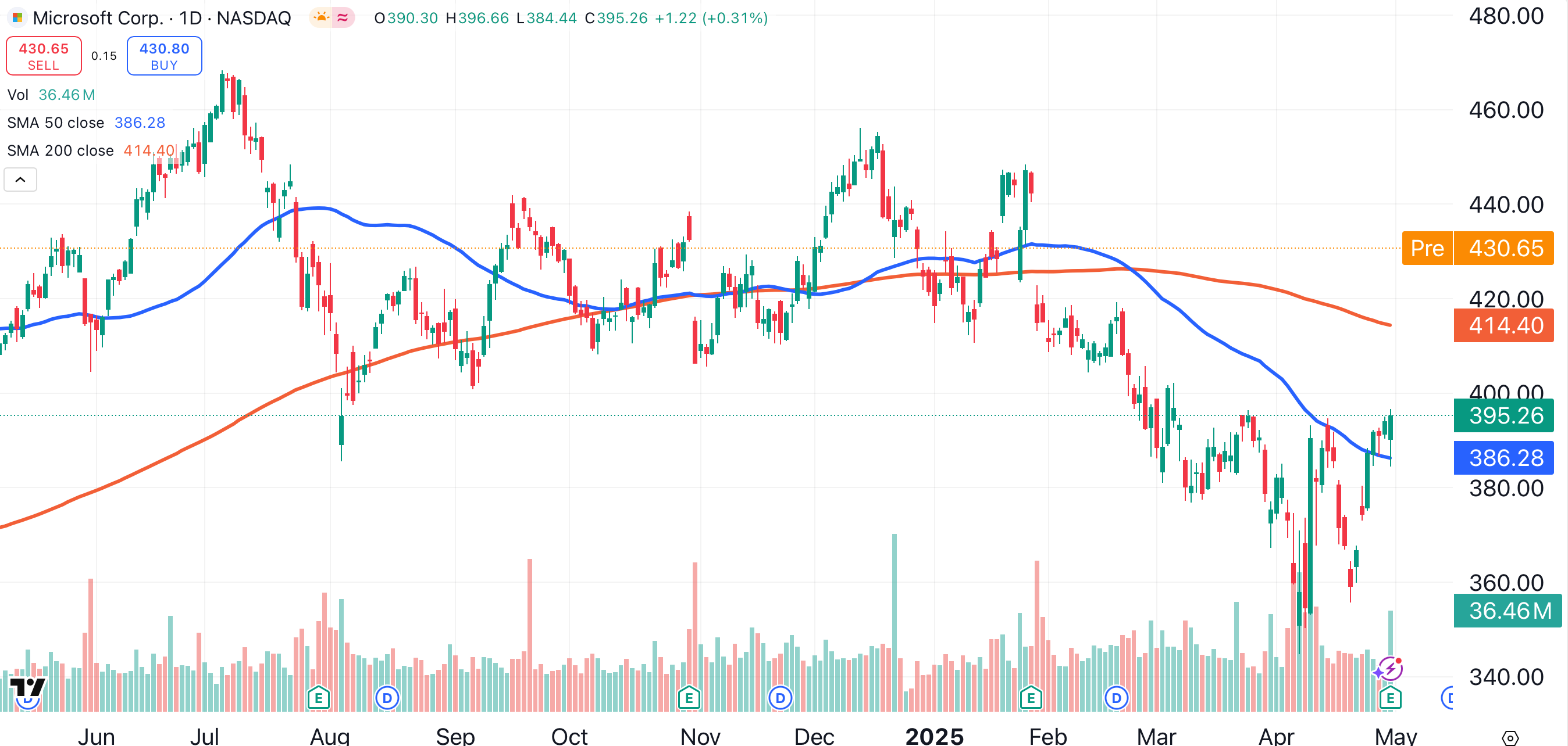 Microsoft has basically been adrift for the past six months, as demonstrated by the directionless activity of its 50-day (blue) and 200-day (red) moving averages. Thursday’s open should see Microsoft trade above its 200-day moving average for the first time since January.