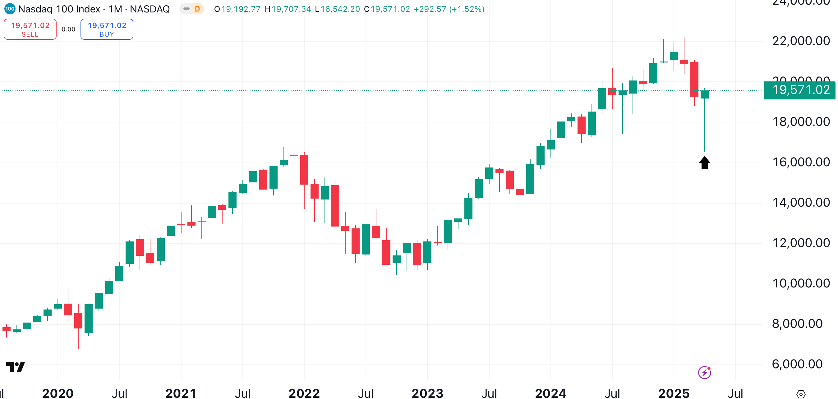 If that’s the case, then we are seeing a huge buy signal on the monthly chart of the Nasdaq 100, in the form of an impressive hammer candle (arrow).