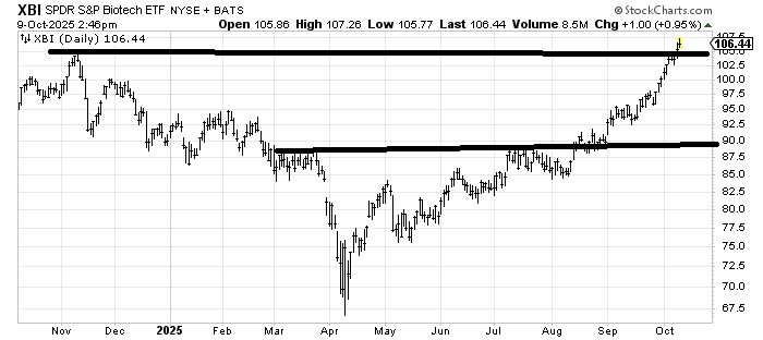 I have been positive on (XBI) , an ETF to be long the biotechs, for quite some time, believing that they would simply and slowly chew their way through resistance. In the past few weeks, though, that pattern has changed and they have gone not quite parabolic but have surged. That is usually a sign they are getting overdone up here and are in need of a pullback. I’d love to see XBI just go sideways in this 104-106 area.