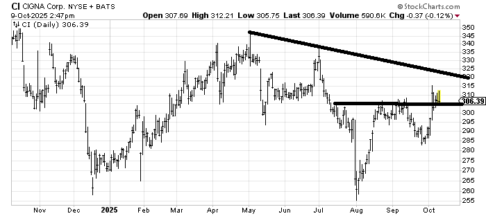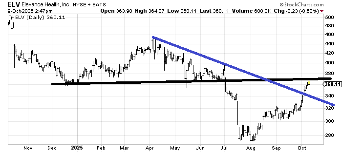 Elevance Health ELV is nearing resistance as well as a measured target. And it’s had quite a run in the month of October. I would guess we see a pullback in the coming weeks, down toward that blue line.