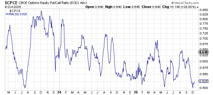 The 10-day moving average of the equity put/call ratio has gotten very low. We have had a correction each time it has gotten down here.