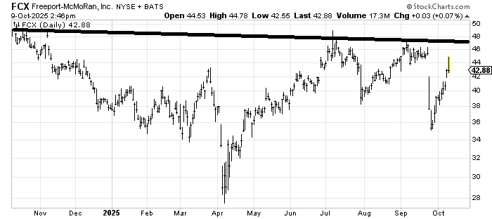 We looked at Freeport McMoRan (FCX) a week or so ago and I thought it ought to fill that gap. it did today; now it needs to set up a new pattern for me to get further involved. That means either coming back down into the 38-40 area (to form a W) or going sideways to digest the push up from 36. There is just too much resistance overhead, and the metals need some cooling off. Here's hoping we get a new setup in the next few weeks.