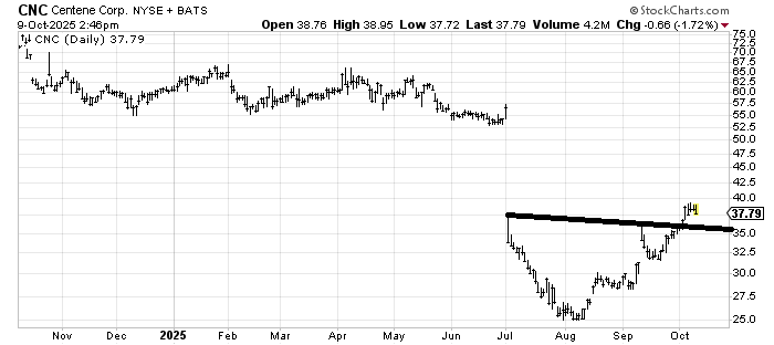 I don’t love the chart of Centene (CNC) , but if it pulls back to 35 and can hold that level, it would give me more confidence that it can eventually fill that gap. The problem is the gap is quite large, so I sense much patience will be needed. For starters, let’s see whether it can hold 35 on the pullback.