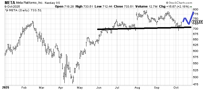 As for Meta (META) , which finally had a good day: My initial thought is it ought to get into the 750 area, but if it rallies, pulls back and then rallies again the setup would be much better.