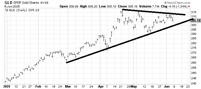 I want to revisit the chart of GLD since I said last week I thought it would break out, and Friday’s action told me I was wrong in that assessment. A break of 300 (round number/uptrend line) would confirm that I was wrong to think it would break out.