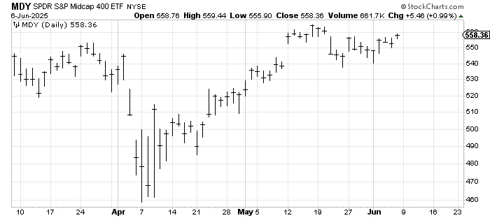To that, I will add the chart of the Mid-Caps. Typically, the Mid-Caps MDY and small caps (IWM) travel together. Only, now we have IWM over the May high and MDY still under it.