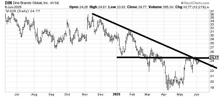 Dine Brands DIN is an interesting chart because it has so much resistance, even if it can cross over this resistance at 25, but also because it has such a big yield. Lately, the high-paying dividend stocks have languished, so over 25 would be quite a change in sentiment for this group.