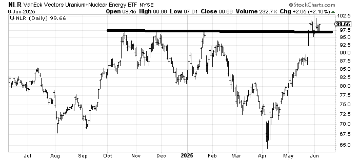 NLR, an ETF to be long Uranium and Nuclear Energy, is not my kind of chart because it is up at the top, but as long as it doesn’t break back under 95, it should be okay. I do wonder if energy rallies, does it do so at the expense of these ‘new energy’ stocks?