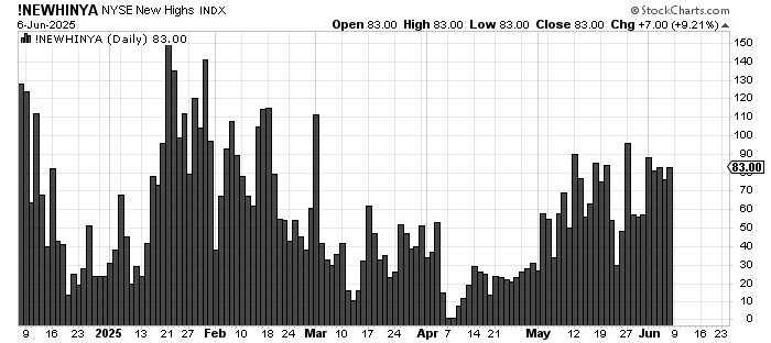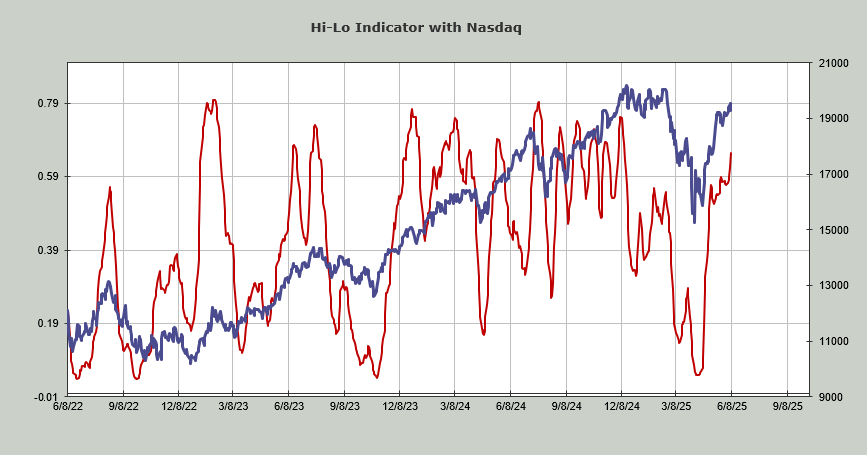Yet the number of stocks making new highs refuses to expand. The good news is the Hi-Lo Indicator is heading upward, but it’s not because new highs are expanding but rather that new lows are still contracting. Typically, when the Russell 2000 moves up to a higher level, as it did Friday, we see an expansion in new highs, and we did not. I’ll keep an eye on that this week. The chart is shown below.