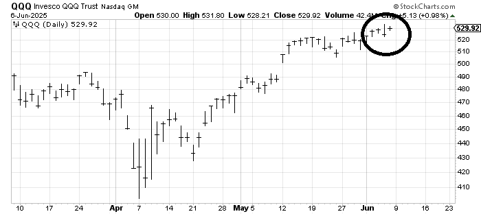 The other charts we’ll watch this week are the QQQs and the SOX. On Friday, neither traded over Thursday’s high.
