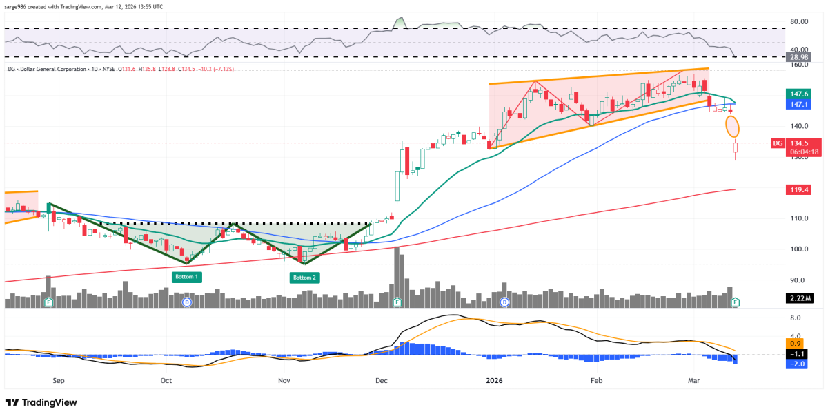 Readers will see that DG blasted out of a double bottom pattern of bullish reversal back in early December. Readers can also see that DG fell from grace after developing a rising wedge pattern of bearish reversal. The stock reacts very well to its technicals. Readers will also see the gap left behind by this morning's selloff.