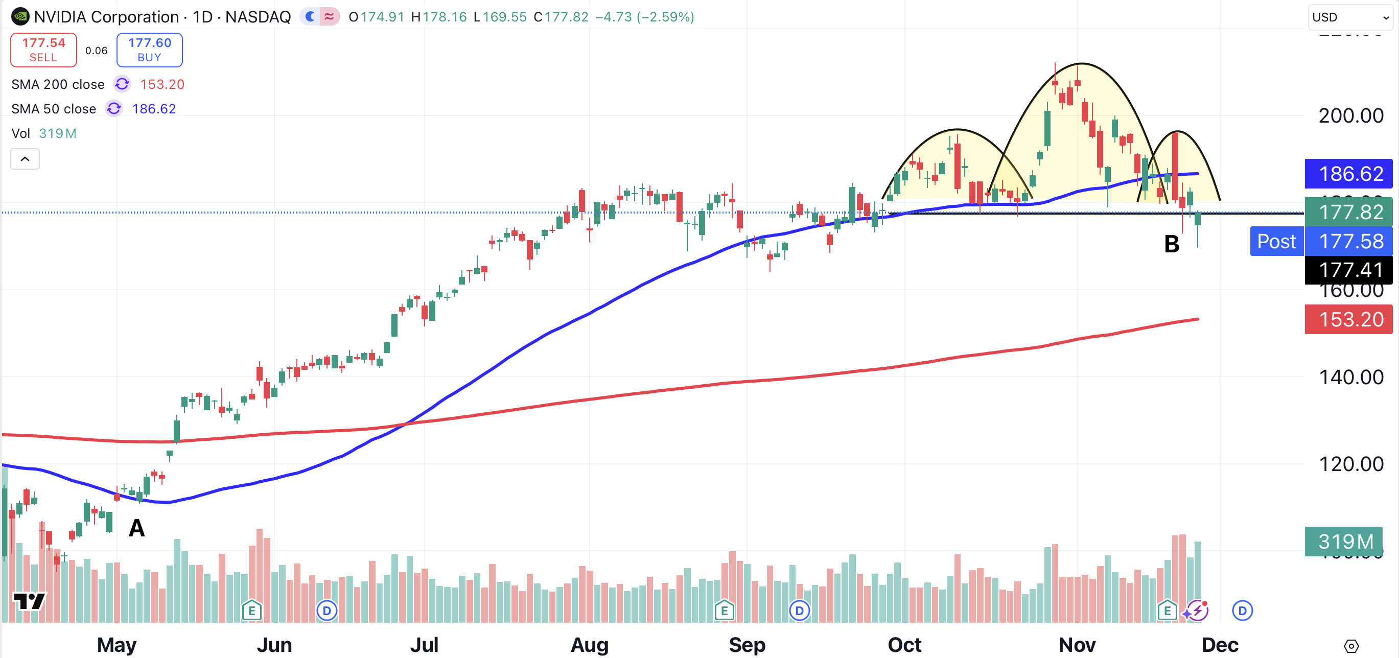 Nvidia has formed a head-and-shoulders pattern (shaded yellow). On Tuesday, the stock broke the neckline (point B) of that pattern at $177 (black horizontal line).