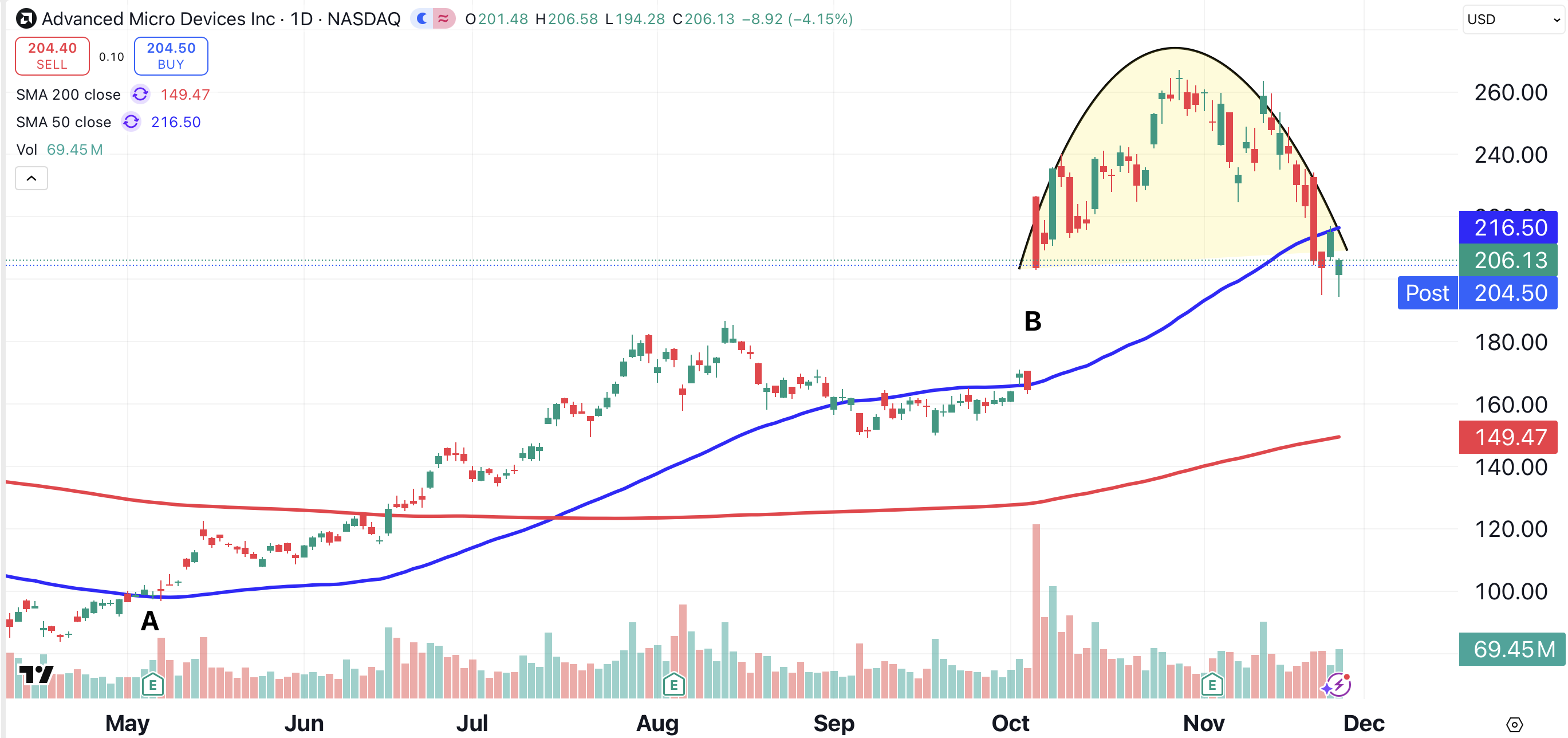 Also, AMD saw a huge gap higher back in October (point B). If that gap fills, the stock could fall to the $170 area.