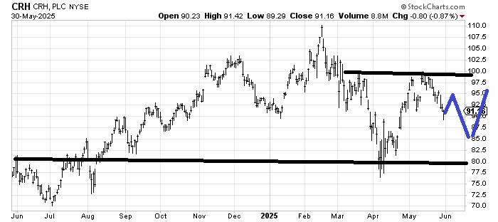 CRH CRH is not a great chart but it is short-term oversold (down 10% in two weeks). If it maps out — a big if — as I have drawn in blue, that would be an interesting pattern because then it will have filled that gap below.