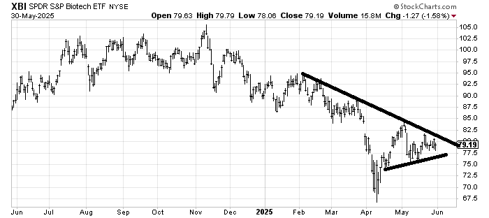Since I am a fan of Amgen AMGN I was asked about the SPDR S&P Biotech XBI, the ETF to be long biotech stocks. Quite frankly I see very little life in the chart. For now I would say it looks like it is trapped between $75 and $85 so it would have to do something different for me to change my mind.