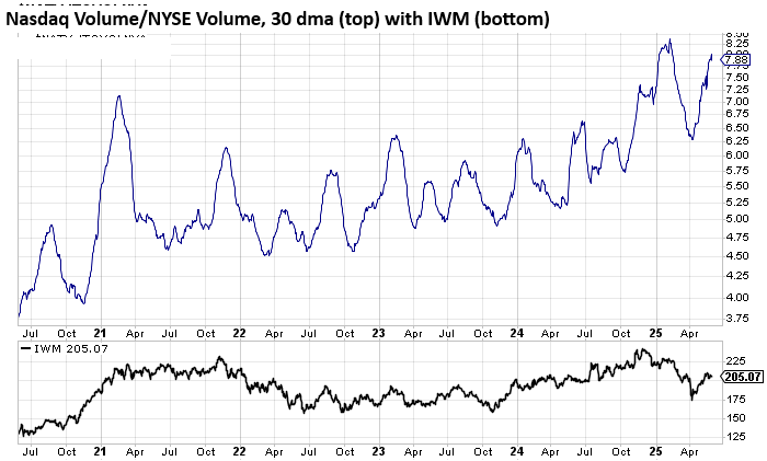To this I can even add that another volume indicator I don’t discuss often is overbought as well. It is the ratio of Nasdaq volume to NYSE volume on a 30-day moving average. Lately I have written a lot about all that penny stock speculation we’re seeing over on the Nasdaq. Eventually that shows up in the indicators and it finally has. You can see this ratio has stretched almost to the heights it saw in January when it topped 8 to 1 (it is now at 7.88).