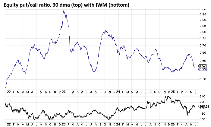 In terms of sentiment, the surveys do not show a high level of complacency (previously noted). The options ratios do. We’ve looked at the 10-day moving average of the equity put/call ratio so today let’s visit the 30-day moving average, which is much slower moving and tends to get less extreme. With the exception of 2021 (not shown on the chart) this mid-50s area has been problematic for the market (meaning too many calls). Once again I have paired it with IWM. It has not turned upward yet though.