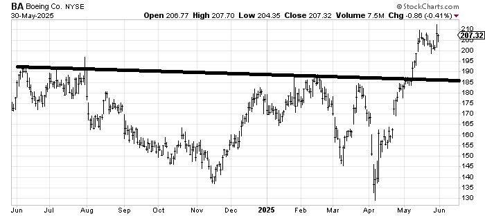 Boeing BA, which I have liked for many months now, has a longer-term target near $250. The question is where is it buyable? From this chart I would have to say all the way back at $185 would be preferable but unless the market weakens significantly it is hard to see it coming all the way back there. So some sideways action for a few weeks (with a floor around $200) would be what I would watch for. A significant break under $200 and that $185 comes into play (and would obviously be accompanied by overall market weakness).