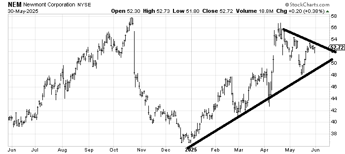 I promised to follow up on Newmont Corp. NEM when it felt as if the correction might be coming to an end. It has begun to feel that way. I’d love to see another down day or two but I’m more focused on if it can cross over $54. I think it can.