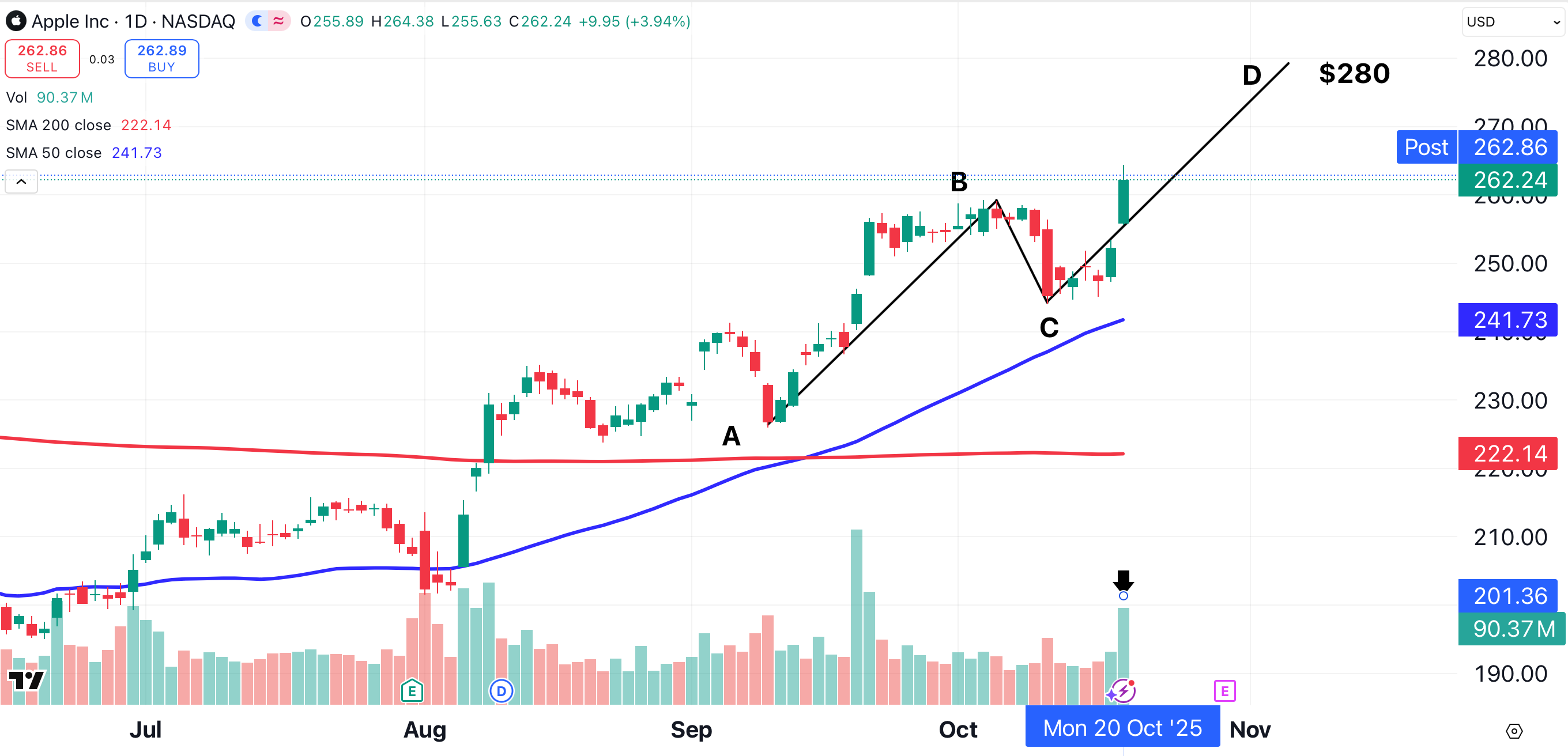 According to the charts, the next stop for Apple is $280. That level represents the end point of an A-B-C-D pattern that has formed on Apple’s chart.